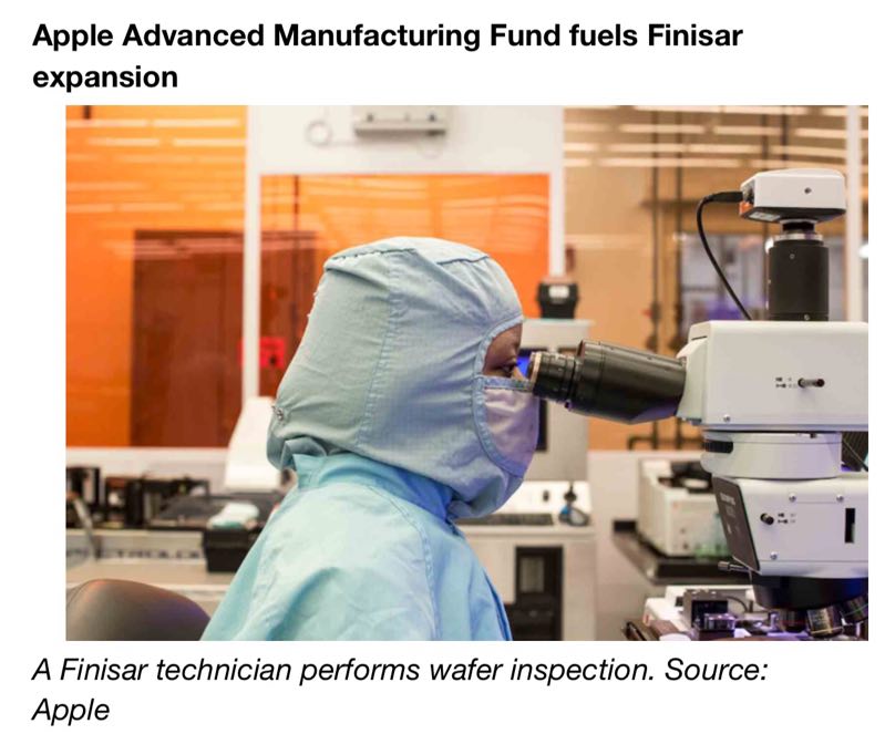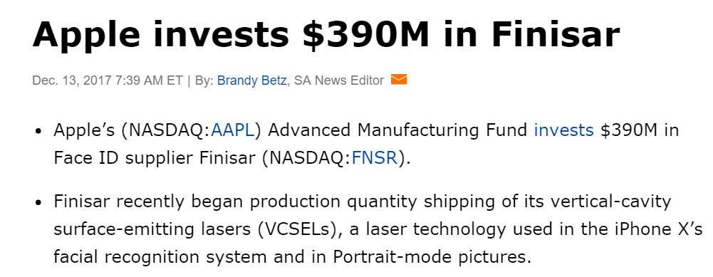 Iccsz訊 美國時間12月13日,據(jù)外媒報道,蘋果先進(jìn)制造業(yè)投資基金斥資3.9億美元給Face ID供應(yīng)商、全球光器件巨頭美國Finisar公司。