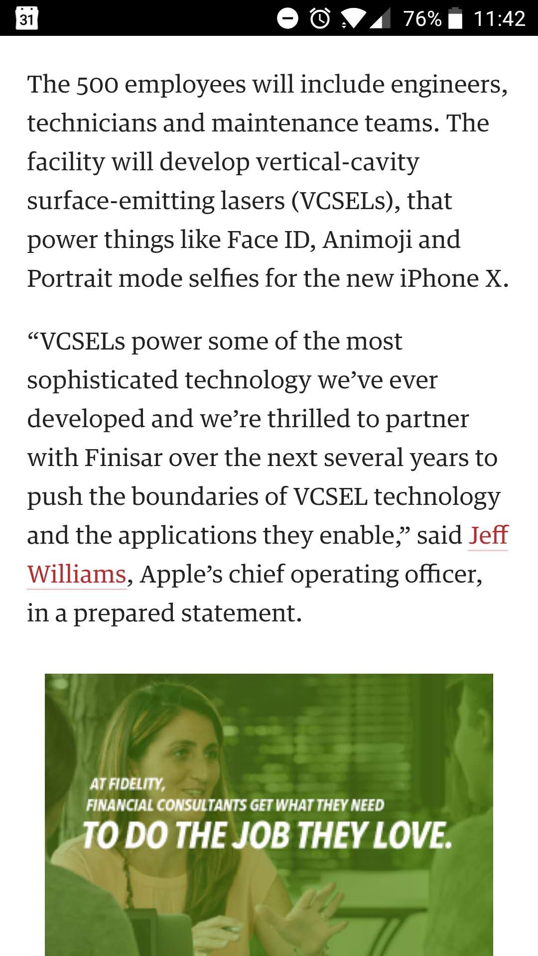 B2:關(guān)于昨日蘋果投資Finisar一事,Finisar發(fā)言做了一些澄清。今年五月初,蘋果CEO庫克表示,他的公司將設(shè)立一個10億美元的基金,以促進(jìn)美國先進(jìn)制造業(yè)就業(yè)。現(xiàn)在蘋果COO表示這個基金的金額沒有上限。該基金第一個項目是向康寧投資2億美元。Finisar表示這次將是蘋果該基金的第二個項目。