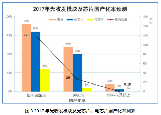 根據(jù)咨詢機構(gòu)以及行業(yè)供給情況給出的光收發(fā)模塊、光芯片、電芯片國產(chǎn)化率測算數(shù)據(jù),10Gb/s速率的光芯片國產(chǎn)化率接近50%,25Gb/s 及以上速率的國產(chǎn)化率遠遠低于 10Gb/s速率,國內(nèi)供應(yīng)商可以提供少量的25Gb/s PIN器件/APD器件外,25Gb/s DFB激光器芯片剛剛完成研發(fā)。25Gb/s速率模塊使用電芯片基本依賴進口。