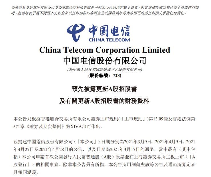 ICC訊 (編輯:Anton)7月15日,中國(guó)電信預(yù)先披露更新A股招股書及有關(guān)更新A股招股書的財(cái)務(wù)資料,根據(jù)報(bào)告期內(nèi)及報(bào)告期后的經(jīng)營(yíng)情況,中國(guó)電信對(duì)2021年1-6月業(yè)績(jī)進(jìn)行了預(yù)計(jì),預(yù)計(jì)2021年1- 6月營(yíng)業(yè)收入約為人民幣2,136.06億元至人民幣2,184.17億元,同比增長(zhǎng)幅度約為11%至 13.5%;歸屬于母公司股東的凈利潤(rùn)約為人民幣175.76億元至人民幣178.55億元,同比增長(zhǎng)幅度約為26%至28%;扣除非經(jīng)常性損益后歸屬于母公司股東的凈利潤(rùn)約為人民幣160.66億元至人民幣163.55億元,同比增長(zhǎng)幅度約為11%至13%。