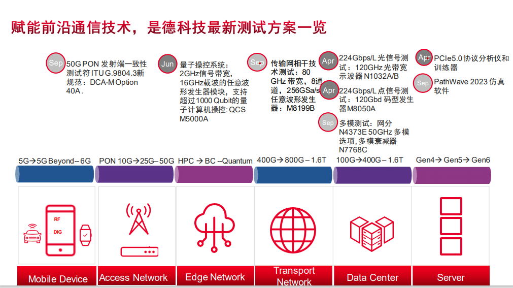 是德科技是一家提供從設(shè)計(jì)、模擬到測(cè)試的系列解決方案的公司。是德科技總能超前的預(yù)判市場(chǎng)發(fā)展趨勢(shì),網(wǎng)絡(luò)需求,最新技術(shù)走向推出新產(chǎn)品。2022年是德科技針對(duì)通訊基礎(chǔ)設(shè)施的幾大發(fā)展趨勢(shì),50G PON、量子計(jì)算、傳輸網(wǎng),下一代數(shù)據(jù)中心等發(fā)展方向提供新的測(cè)試方案。
