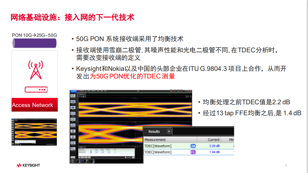 根據(jù)工信部的最新數(shù)據(jù),截至2022年10月底,全國(guó)共有110個(gè)城市達(dá)到千兆城市建設(shè)標(biāo)準(zhǔn),千兆城市平均城市家庭千兆光纖網(wǎng)絡(luò)覆蓋率超過100%,實(shí)現(xiàn)城市家庭千兆光網(wǎng)全覆蓋。隨著各省市對(duì)“千兆光網(wǎng)”政策的大力推進(jìn),10G PON技術(shù)正逐漸完成接入網(wǎng)升級(jí)。而下一代接入網(wǎng)技術(shù)開發(fā)正在路上,今年9月,IEEE和ITU-T已經(jīng)完成了25G和50G PON的標(biāo)準(zhǔn)制定。是德科技預(yù)計(jì)2023年底將會(huì)有25G、50G商業(yè)化產(chǎn)品發(fā)布,2024/2025開始商業(yè)化部署,中國(guó)則領(lǐng)先其他地區(qū)2-3年時(shí)間,直接從10G PON跨越到50G PON的部署。針對(duì)25G、50G PON的預(yù)研,是德科技推出了相應(yīng)的測(cè)試技術(shù),測(cè)試軟件和硬件,加快市場(chǎng)應(yīng)用。公司和中國(guó)以及其他國(guó)家的頭部企業(yè)在ITU G.9804.3 項(xiàng)目上緊密合作,開發(fā)出為50G PON優(yōu)化的TDEC 測(cè)量。