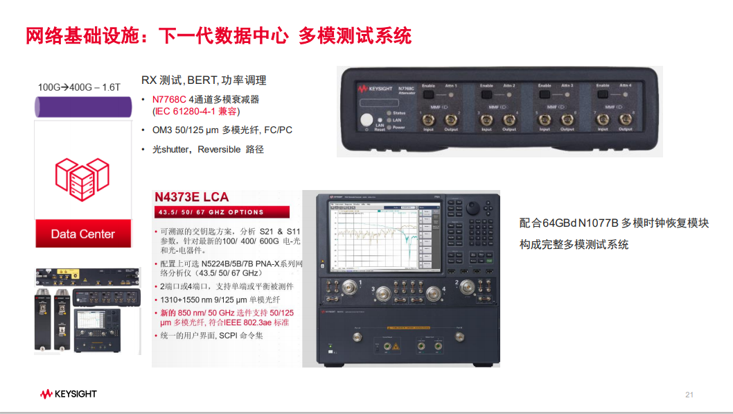 當(dāng)前數(shù)據(jù)中心產(chǎn)品的測(cè)試挑戰(zhàn)在于如何產(chǎn)生224G的電信號(hào),如何進(jìn)行224G的光、電信號(hào)進(jìn)行有效測(cè)試,以及如何對(duì)112G多模進(jìn)行測(cè)試。是德科技今年推出的224 Gbps / 1.6T 業(yè)內(nèi)最完整解決方案為產(chǎn)業(yè)界進(jìn)入下一代數(shù)據(jù)中心做好了鋪墊。在該方案中, N1032A/B是光口測(cè)試的天花板,支持超120GHZ的光口測(cè)試模塊,光參考接收機(jī)的范圍49.8-224Gb/s,全面校準(zhǔn)且易于使用。M8050A是目前業(yè)內(nèi)唯一可以實(shí)現(xiàn)超120G誤碼產(chǎn)生的解決方案,推動(dòng) 224 Gbps技術(shù)測(cè)試。對(duì)于國(guó)內(nèi)目前廣泛應(yīng)用的多模的產(chǎn)品的測(cè)試,是德科技也有完善的解決方案——多模測(cè)試系統(tǒng)。