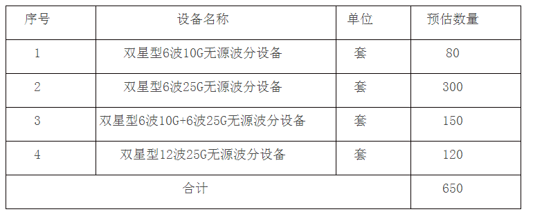 ICC訊 (編輯:Nicole) 近日,甘肅移動啟動2020-2022年無源波分設(shè)備采購項目(招標(biāo)項目編號:GSYD20200001813),擬采購650套無源波分設(shè)備。采購清單詳見下表: