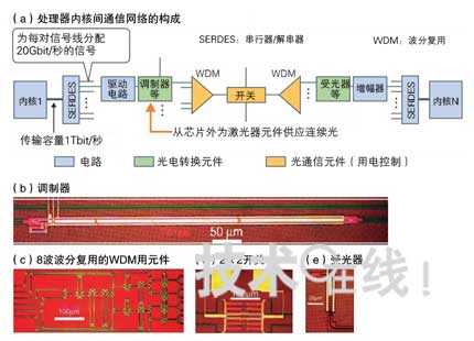 (a)為IBM芯片上光通信網(wǎng)絡(luò)的構(gòu)成。處理器內(nèi)核間的數(shù)據(jù)利用Si芯片上的光通信網(wǎng)絡(luò)傳輸。(b~e)為將光通信的各功能集成在Si芯片上的實例。WDM相當(dāng)于“高速公路的入口”。