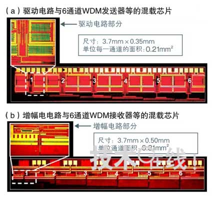 IBM最新的光電路混載芯片示例。(a)為光調(diào)制器與其驅(qū)動電路、WDM發(fā)送器集成于1枚芯片。(b)為WDM接收器、受光器及增幅電路集成于1枚芯片。收發(fā)元件合計面積為3.1mm2。單位通道以約0.5mm2的面積實現(xiàn)。