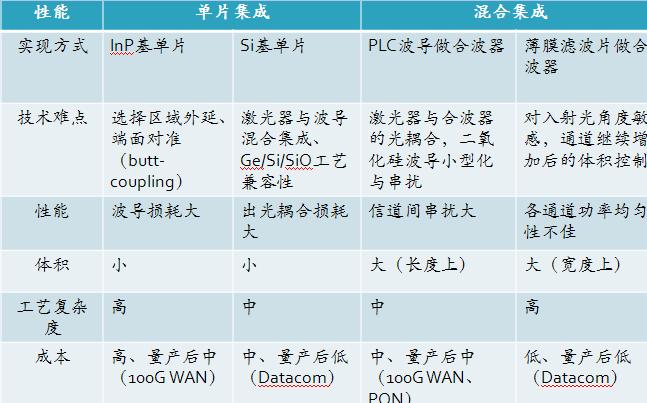 現(xiàn)有的40G QSFP+數(shù)據(jù)中心用光模塊是基于VCSEL和陣列多模光纖的數(shù)據(jù)中心光模塊方案,采用高精度無源貼裝技術(shù),采用Chip-on-board工藝實(shí)現(xiàn)低成本。后續(xù)100G數(shù)據(jù)中心用集成光器件靠硅光集成來實(shí)現(xiàn),比如采用硅基單片和混合集成技術(shù)的100G光收發(fā)芯片和采用硅基單片和混合集成技術(shù)的100G 有源光纜產(chǎn)品。最后周博士還對比了單片集成和混合集成各自從在性能體現(xiàn)的不同優(yōu)劣勢。