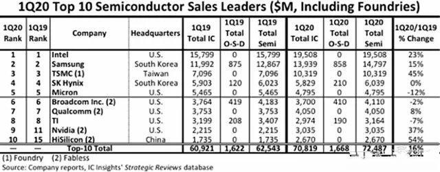 日前,調(diào)查公司IC Insights發(fā)布2020年第一季度全球銷售額排名前十的半導(dǎo)體公司,第一到九名是英特爾、三星、臺(tái)積電、SK海力士、美光、博通、高通、德州儀器和英偉達(dá),海思以26. 7億美元、年增54%的最快增長(zhǎng)速度排名第十。如果考慮臺(tái)積電實(shí)際是一個(gè)代工公司,并沒(méi)有IC出售,可以說(shuō)海思是中國(guó)最大的芯片公司。另外臺(tái)積電快速增長(zhǎng)45%,海思從其份額也快速提升,19年已經(jīng)到14%,業(yè)界認(rèn)為估計(jì)Q1很可能已經(jīng)達(dá)到18%上下了。如果今年發(fā)展順利,海思將成為第一個(gè)銷售額過(guò)百億美元的中國(guó)芯片設(shè)計(jì)公司。