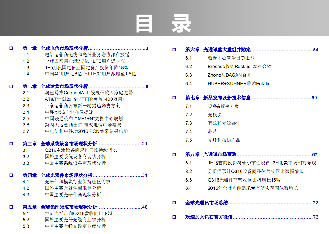 ICCSZ訊 訊石2016年第二季度的《全球光通訊市場分析報(bào)告》近期出刊,會員公司可網(wǎng)上登錄下載或者是通過郵件接收。本次季度報(bào)告圍繞運(yùn)營商、系統(tǒng)設(shè)備、光器件、光纜、新產(chǎn)品、重大重組并購案等進(jìn)行了系統(tǒng)的市場分析。此次季報(bào)既是是對上半年光通訊市場新動態(tài)的的一次全方位的總結(jié),又是對下半年光通訊市場的一次有效把控。相信會給通訊行業(yè)的朋友們指引方向,緊跟市場風(fēng)向。