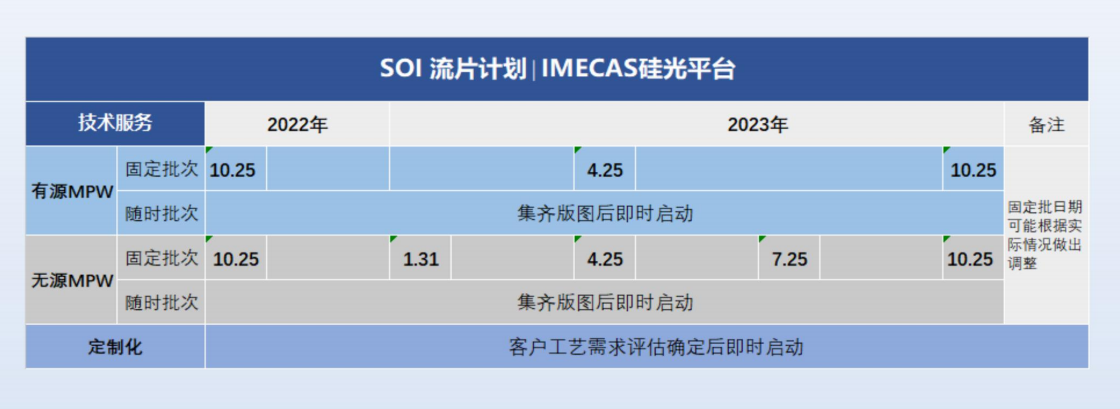 ICC訊 中科院微電子所基于8英寸CMOS工藝線開發(fā)了國內首個具有完整硅光工藝流片能力的硅光平臺。近日,中科微光子科技(成都)有限公司公布其2022年下半年及2023年基于厚硅SOI、 石英襯底、 SiN材料等技術的流片計劃。