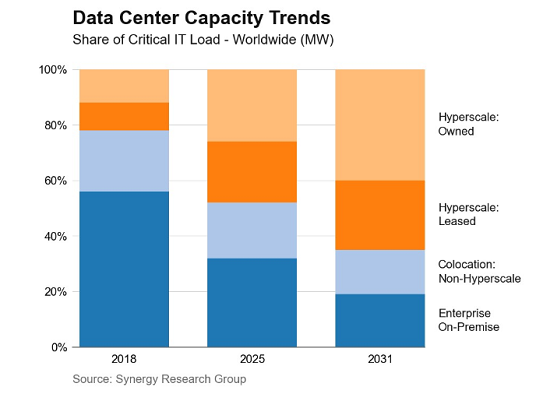 展望2031年,超大規(guī)模運(yùn)營(yíng)商將占所有容量的67%,而本地部署將降至僅19%。在此期間,所有數(shù)據(jù)中心的總?cè)萘繉⒊掷m(xù)快速增長(zhǎng),主要驅(qū)動(dòng)力是超大規(guī)模容量增長(zhǎng)超過(guò)三倍。盡管托管容量占總?cè)萘康谋壤龑⒕徛陆担泄苋萘勘旧砻磕耆詫⒁越咏鼉晌粩?shù)的速度增長(zhǎng)。經(jīng)過(guò)一段持續(xù)的基本無(wú)增長(zhǎng)期后,得益于生成式AI應(yīng)用和GPU基礎(chǔ)設(shè)施,企業(yè)本地部署的數(shù)據(jù)中心容量正獲得一定提振。盡管如此,在預(yù)測(cè)期內(nèi),本地部署占總?cè)萘康姆蓊~每年仍將下降約兩個(gè)百分點(diǎn)。
