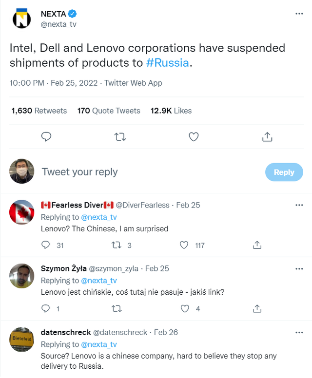 值得注意的是,聯(lián)想也在這批制裁俄羅斯的企業(yè)之中。