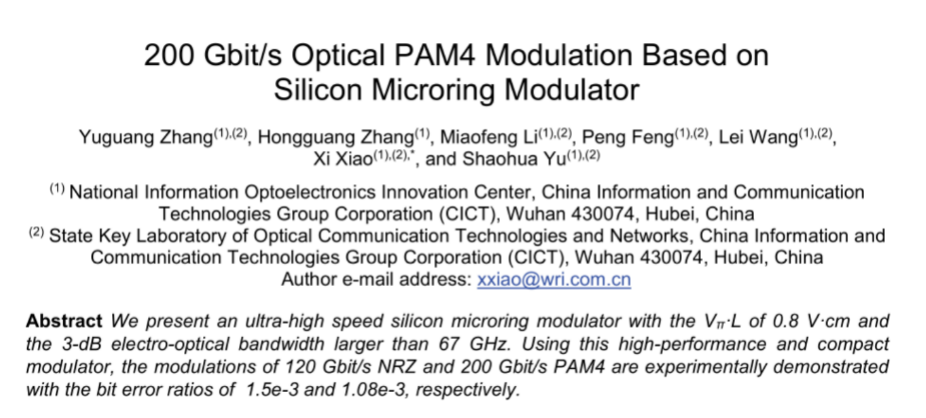 ICC訊 日前,國(guó)家信息光電子創(chuàng)新中心(NOEIC)和中信科集團(tuán)光纖通信技術(shù)與網(wǎng)絡(luò)國(guó)家重點(diǎn)實(shí)驗(yàn)室在超高速硅光芯片技術(shù)方向取得重要進(jìn)展,首次利用硅光微環(huán)調(diào)制器產(chǎn)生了200 Gb/s PAM4光信號(hào)(此前最高水平為Intel的128Gb/s),并成功實(shí)現(xiàn)2km單模光纖傳輸。該成果為下一代800G光模塊和共封裝(co-packaged)光子引擎提供了超低功耗超高集成度的芯片技術(shù)方案。
