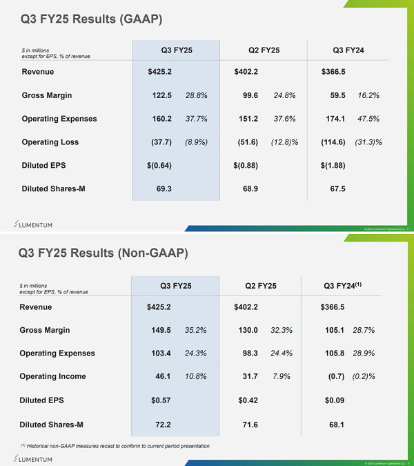 ICC訊 2025年5月6日,Lumentum Holdings Inc.(以下簡稱“Lumentum”)公布了截至2025年3月29日的2025財(cái)年第三季度財(cái)務(wù)報(bào)告。報(bào)告顯示,公司銷售收入為4.252億美元,GAAP毛利率為28.8%,非GAAP毛利率為35.2%。GAAP稀釋后每股凈虧損為0.64美元,非GAAP稀釋后每股凈收益為0.57美元。