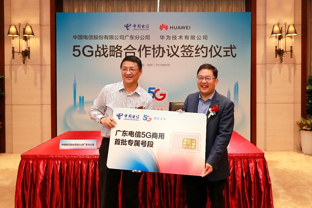 6月6日5G商用牌照的發(fā)放,標(biāo)志著我國5G建設(shè)將進入一個高速發(fā)展的階段。中國電信廣東公司2019年將在深廣東佛建設(shè)超過6000個5G基站,未來三年建設(shè)4.6萬個基站,整體投入超過400億元。本次簽訂儀式上,中國電信廣東公司總經(jīng)理陳志然向華為公司董事彭中陽授予中國電信廣東公司5G商用首批專屬號段卡。