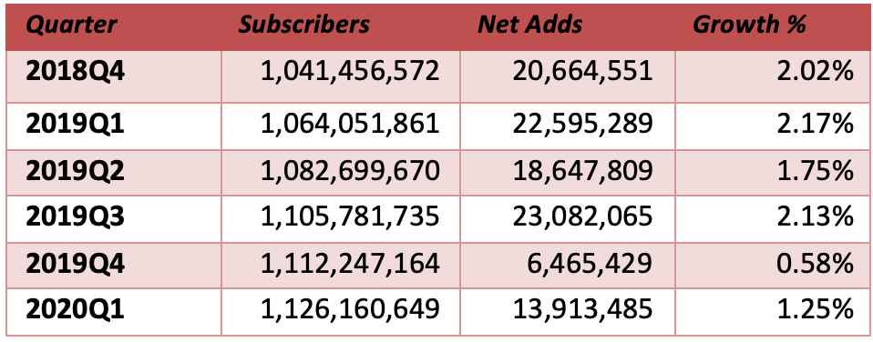 在2019年第四季度固定寬帶用戶略有下降之后,本季度中國報告了1.45%的增長,與過去記錄的通常3-5%相比要慢得多。 2020年第一季度,中國三大運營商之一的中國電信首次報告了固定寬帶用戶的減少。除了市場飽和以及大流行對支出的影響外,造成這些趨勢的另一個原因可能是用戶使用了最近推出的5G服務(wù)。在過去的幾個月中,中國的5G用戶大幅增加,中國的數(shù)量已從2019年第四季度的500萬增加到2020年第一季度的4800多萬。