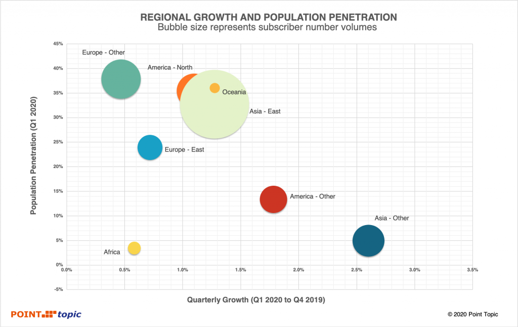 就季度增長率而言,除三個地區(qū)(北美,美洲其他地區(qū)和東亞)之外,所有其他地區(qū)在2020年第一季度的增長均比2019年第四季度有所放緩。盡管如此,固定寬帶用戶在所有地區(qū)均有所增長。