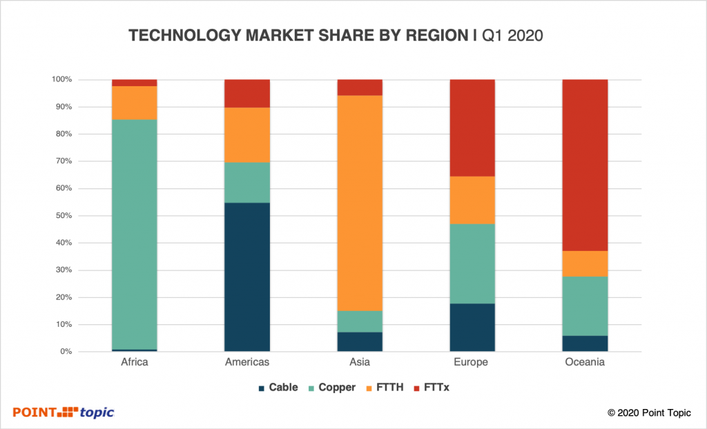 在Q419至Q120之間,F(xiàn)TTH連接在固定寬帶用戶總數(shù)中的市場份額持續(xù)增長,增長了0.57%。 Cable用戶的份額增長了0.13%,而Copper用戶(ADSL)繼續(xù)惡化,下降了0.61%。 FTTx訂閱的份額繼續(xù)保持穩(wěn)定。 在非洲,Copper連接仍占主導(dǎo)地位,而Cable是美洲最流行的技術(shù)。