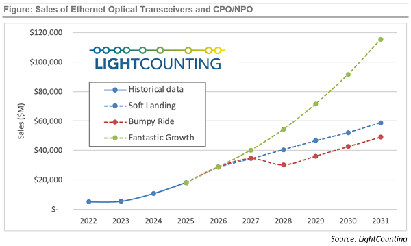 2027-2031年的市場增長存在更大的不確定性。如下圖所示,“快速增長”的情景有可能在2027年及以后延續(xù)。2004-2025年光收發(fā)器銷售的歷史數(shù)據(jù)顯示出一個周期性模式,即2-3年的增長期之后會出現(xiàn)一個持平或負增長的年份。大多數(shù)周期都是由供應鏈再平衡導致的,而我們在2027-2028年可能會看到類似的情況。我們的預測設想了“軟著陸”的情景,但供應鏈的平衡往往是通過市場調(diào)整來恢復的——即“顛簸前行”的情景。