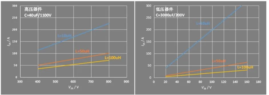高壓器件為了滿足高壓的測試需求,須選擇耐壓值高的母線電容,但此類電容容值較小,如用該電容來測試低壓器件,能夠?qū)崿F(xiàn)的最大電流將大打折扣。對于功率器件來說,耐壓和導(dǎo)通電阻是一對矛盾的關(guān)系,低壓器件往往需要更大測試電流,所以低壓器件應(yīng)選擇容值更大的母線電容。此外,由上圖可知,在測試電壓相同,負(fù)載電感越小可實(shí)現(xiàn)的最大電流值越大,為了滿足低壓器件大電流的要求,也應(yīng)選擇感量更小的負(fù)載電感。