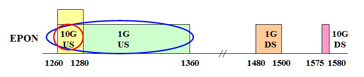圖1 10G/1G EPON上行波長范圍收窄示意圖