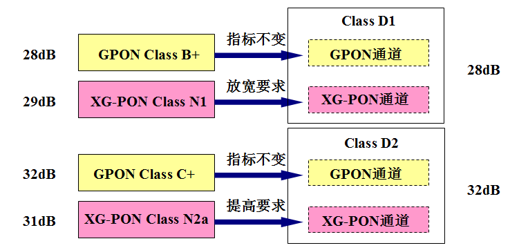 雙模PON口通常實(shí)現(xiàn)兩種鏈路預(yù)算等級(jí),一種是GPON Class B+與XG-PON Class N1集成,另一種是GPON Class C+與XG-PON Class N2a集成。由于GPON、XG-PON的標(biāo)準(zhǔn)規(guī)定的鏈路預(yù)算值略有差異(GPON Class B+是28dB,XG-PON Class N1是29dB;GPON Class C+是32dB,XG-PON Class N2a是31dB),二者集成時(shí)需要形成統(tǒng)一的鏈路預(yù)算值??紤]到雙模PON口需兼容現(xiàn)網(wǎng)已部署的GPON ONU,因此應(yīng)按照GPON鏈路預(yù)算值進(jìn)行統(tǒng)一(示意圖如圖4所示)。中國電信提出了用于雙模PON口Class D1(28dB)、Class D2(32dB)兩個(gè)鏈路預(yù)算等級(jí),并在ITU-T標(biāo)準(zhǔn)的基礎(chǔ)上略作調(diào)整,形成了光接口參數(shù)的具體指標(biāo)。另外,需要說明的是,雙模PON口的指標(biāo)只涉及OLT側(cè),ONU光接口指標(biāo)沒有變化。
