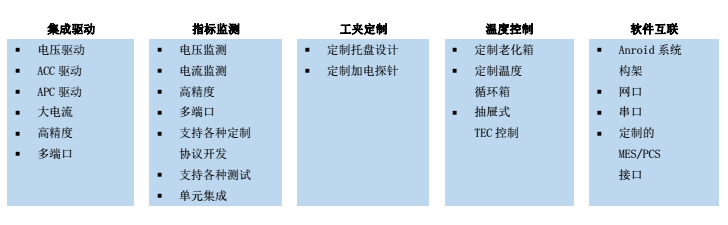 武漢固捷SWB-2000C自動(dòng)測(cè)試系統(tǒng)是專為光電子、光器件行業(yè)研發(fā)、設(shè)計(jì)的一款高密度在線老化測(cè)試系統(tǒng)平臺(tái)。通過選裝不同的功能模塊可滿足COB光模塊及半導(dǎo)體激光器(LD TO)老化測(cè)試。該系統(tǒng)采用具有專利技術(shù)的結(jié)構(gòu)設(shè)計(jì)以及固捷測(cè)試軟件平臺(tái),并整合了業(yè)界領(lǐng)先的環(huán)境測(cè)試單元,為客戶提供高效、精確、穩(wěn)定的量產(chǎn)老化測(cè)試能力。該系統(tǒng)可實(shí)時(shí)監(jiān)控整個(gè)測(cè)試過程,數(shù)據(jù)完整可溯,可與工廠MES/PCS系統(tǒng)無縫對(duì)接,實(shí)現(xiàn)個(gè)性化數(shù)據(jù)處理。