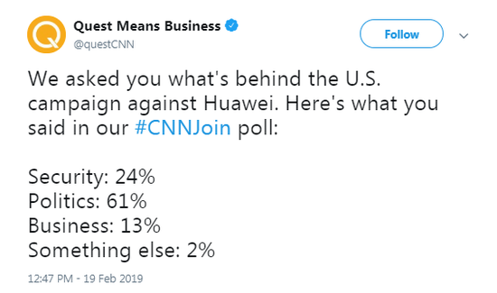 CNN電視臺Quest Means Business節(jié)目官方推特昨日播出了最新的調(diào)查結(jié)果:61%美國群眾認(rèn)為美國打壓華為是政治原因。僅24%的群眾認(rèn)為是出于安全考慮,13%群眾認(rèn)為是商業(yè)原因。