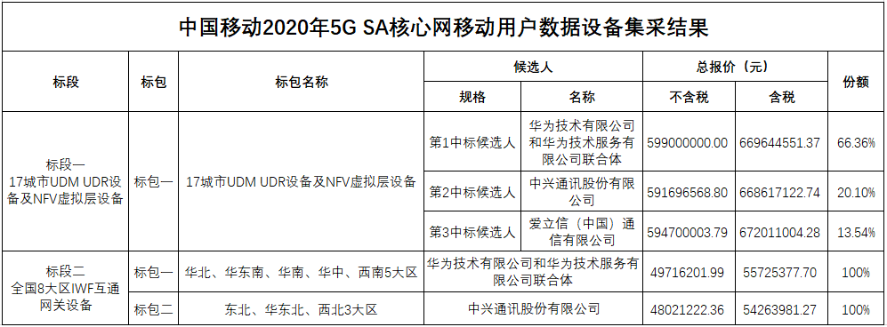 ICCSZ訊(編輯:Debi)2月21日,中國移動公布2020年5G SA核心網(wǎng)移動用戶數(shù)據(jù)設(shè)備集中采購結(jié)果,中標(biāo)候選人公示如下: