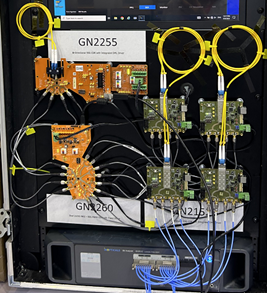 在本次展會上,Semtech做了一個有意思的live demo,如下圖所示,將4個GN2152 based 25G LR的參考模塊、與GN2255的光評估板、及Gearbox芯片GN2260(2*25Gbps NRZ <-> 50Gbps PAM4)的電評估板級聯(lián)在一起,在收發(fā)兩個方向都實現(xiàn)了長時間的無誤碼傳輸。該demo有效地展示了Semtech針對無線市場的全套解決方案,以及其模擬CDR對信號尤其是抖動的卓越處理能力!