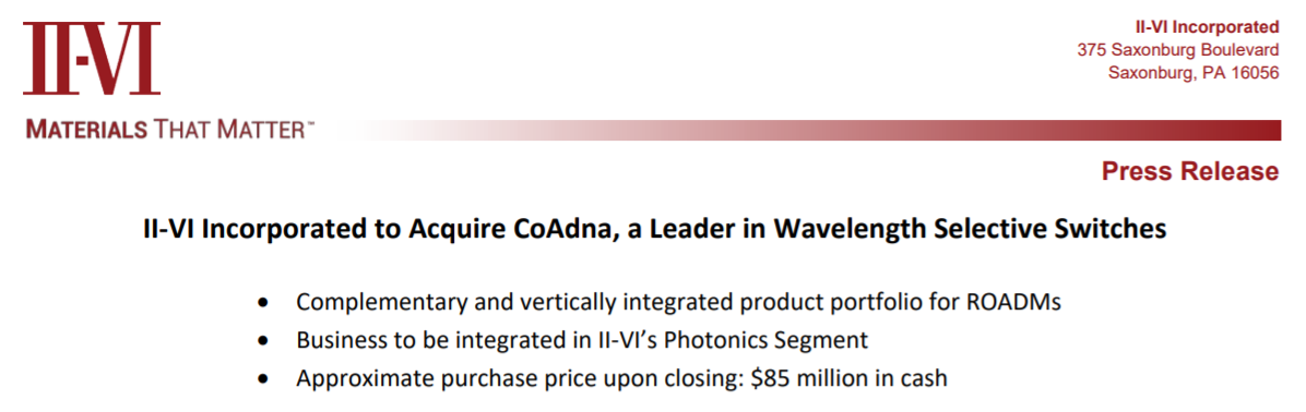ICCSZ訊(編譯:Aiur) 美國時(shí)間3月26日,全球工程材料和光網(wǎng)絡(luò)解決方案領(lǐng)導(dǎo)者II-VI公司宣布,將收購科納控股(CoAdna, Holdings)??萍{總部位于美國加州桑尼韋爾,現(xiàn)金交易的價(jià)值大約為8500萬美元,交易價(jià)格包括收購CoAdna約4000萬美元的現(xiàn)金,全部交易預(yù)計(jì)在2018日歷年第三季度完成。此項(xiàng)交易將強(qiáng)化II-VI公司ROADMs產(chǎn)品垂直整合能力,CoAdna公司將納入II-VI公司Photonics部門。