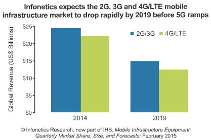 * Infonetics / IHS預(yù)計(jì),隨著地球到達(dá)宏蜂窩移動(dòng)部署結(jié)束,2014年至2019年2G/3G/4G移動(dòng)基礎(chǔ)設(shè)施市場將從幾乎470億美元下降至270億美元。