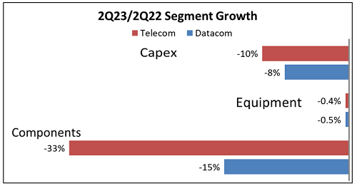 與光器件銷售額的急劇下降形成對比的是,2023年第二季度網(wǎng)絡(luò)設(shè)備的銷售額保持穩(wěn)定(下降0.4-0.5%)。這一異?,F(xiàn)象的原因是2021-2022年許多組件供不應(yīng)求時,設(shè)備訂單大量積壓?,F(xiàn)階段,設(shè)備供應(yīng)商仍在追趕一年多前的訂單。