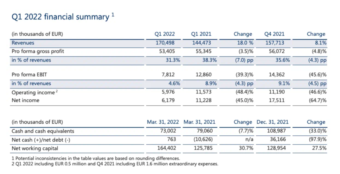 2022年第一季度,ADVA營收1.7億歐元,與去年同期的1.44億歐元相比同比增長18%。上個(gè)季度營收1.58億歐元,環(huán)比增長8.1%。2022 年第一季度的收入增長主要受通信服務(wù)提供商 (CSP) 和互聯(lián)網(wǎng)內(nèi)容提供商 (ICP) 需求增長的推動。ADVA 2022年第一季度毛利率31.3%,去年同期為38.3%,上個(gè)季度毛利率為35.6%。2022年第一季度凈收入617.9萬歐元,相比去年同期的1.12億歐元下滑45%,比上個(gè)季度的1.75億歐元下滑64.7%。