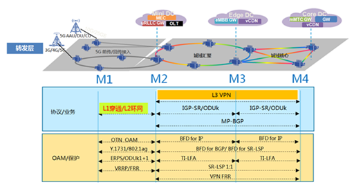 基于OTN的5G承載組網(wǎng)架構(gòu)如圖1所示。根據(jù)不同的部署位置,用于5G承載的OTN設(shè)備可分為4種類型:接入設(shè)備(M1)、匯聚設(shè)備(M2)、核心設(shè)備(M3、M4)。根據(jù)接入M2的不同方式,M1可進(jìn)一步分為透傳型M1和分組型M1兩種形態(tài)。