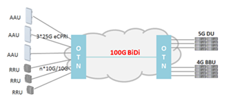 基于OTN的前傳技術(shù)方案如圖3所示,在一個5G AAU站點和DU集中點之間提供點到點連接??蛻魝?cè)可提供3×25G eCPRI、3×6G/2.5G CPRI和10GE/GE等多種接口類型,支持4G/5G/專線等多業(yè)務(wù)統(tǒng)一承載。線路側(cè)初期推薦采用成熟度較高的100G速率,后期隨著5G高頻站的引入,可采用200G速率以滿足業(yè)務(wù)增長的需求。為節(jié)省纖芯,實現(xiàn)一個站點只需要一根光纖的目標(biāo),線路側(cè)需要支持單纖雙向(BiDi)方案。