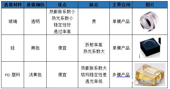 光模塊中應(yīng)用到的透鏡按材料區(qū)分,一般有玻璃、硅、PEI塑料三種,優(yōu)缺點(diǎn)對(duì)比如下表。玻璃透鏡是傳統(tǒng)工藝中經(jīng)常用的材料,常用于高端模塊;硅透鏡價(jià)格便宜,這兩年發(fā)展勢(shì)頭很猛烈,中低端COB、Box封裝模塊中已經(jīng)大量應(yīng)用了;PEI塑料透鏡在多模短距模塊中應(yīng)用,最大的特點(diǎn)就是夠便宜。