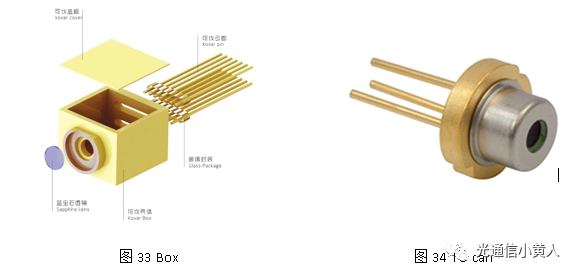 Box封裝就是個(gè)矩形金屬外殼,歷史悠久,Box表面一般會(huì)鍍金,可分為底座和蓋板兩部分,芯片、透鏡貼在底座里。Box封裝目前常見(jiàn)于電信級(jí)光模塊。