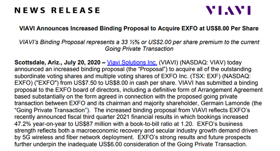 ICC訊(編譯:Nina)美國(guó)亞利桑那州斯科茨代爾,2021年7月20日--Viavi Solutions Inc.(VIAVI)(納斯達(dá)克:VIAV)今天宣布了一項(xiàng)新的約束性提案,以收購(gòu)EXFO Inc.(EXFO)(納斯達(dá)克:EXFO;多倫多證交所:EXF)所有已發(fā)行的次級(jí)有投票權(quán)股份和多重投票權(quán)股份,價(jià)格從每股現(xiàn)金7.50美元增加至8.00美元。VIAVI已向EXFO董事會(huì)提交了一份具有約束力的提議,包括一份明確形式的安排協(xié)議(Arrangement Agreement),該協(xié)議實(shí)質(zhì)上是基于EXFO與其董事長(zhǎng)兼大股東Germain Lamonde(“私有化交易”)之間擬議的私有化交易達(dá)成的協(xié)議形式。VIAVI的新提案反映了EXFO最近公布的2021財(cái)年第三季度業(yè)績(jī),即訂單收入同比增長(zhǎng)47.2%至8700萬(wàn)美元,訂單出貨比達(dá)到1.20。EXFO的強(qiáng)勁業(yè)績(jī)既反映了宏觀經(jīng)濟(jì)的復(fù)蘇,也反映了5G無(wú)線和光纖網(wǎng)絡(luò)部署推動(dòng)的長(zhǎng)期行業(yè)增長(zhǎng)需求。
