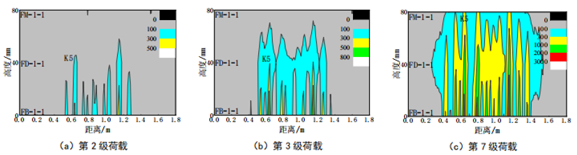 圖9為快應(yīng)變?cè)茍D,圖中可知,結(jié)構(gòu)應(yīng)變達(dá)100με時(shí)產(chǎn)生微裂紋,300με時(shí)出現(xiàn)可見裂縫。FB-1-1光纜在第1級(jí)荷載達(dá)100με(下表面開裂),第2級(jí)達(dá)300με;FD-1-1第2級(jí)達(dá)100με,第3級(jí)達(dá)300με(開裂至下部箍筋);FM-1-1第5級(jí)達(dá)100με,第7級(jí)明顯擴(kuò)展(至梁中部)。應(yīng)變?cè)茍D顯示K5裂縫從第1級(jí)微裂逐步擴(kuò)展至第7級(jí)梁體中部。