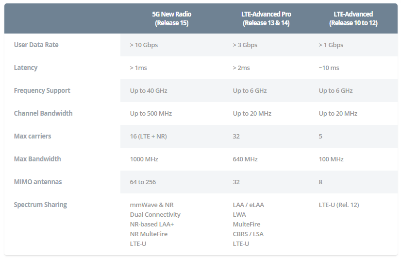 如前所述,網(wǎng)絡(luò)技術(shù)的范圍也大大增加。LTE在過去幾年里經(jīng)歷了許多改進(jìn)。從引入256QAM和LTE-A載波聚合,到支持通過LAA、LWA和Multefire與LTE-A Pro更廣泛地使用未經(jīng)許可的頻譜。這就是為什么今天的4G網(wǎng)絡(luò)比多年前最初推出時(shí)快得多。5G技術(shù)又向前邁進(jìn)了一步,要求使用256QAM并改進(jìn)載波聚合技術(shù),以支持更靈活的未授權(quán)頻譜、低于6GHZ和 mmWave頻率的載波波段。下面這張 Arm 公司2016年的圖片簡明扼要地解釋了這種核心差異。