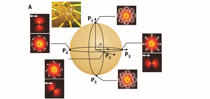 研究人員利用外爾半金屬作為載體,發(fā)現(xiàn)光相位的空間變化可以引發(fā)受激發(fā)電子布居數(shù)的空間分布,進(jìn)而產(chǎn)生以光心為原點(diǎn)‘渦旋’的光電流(圖3)。區(qū)別于其他光致電流效應(yīng),這種非線性光學(xué)過(guò)程不存在于平面波中,且其產(chǎn)生的非局域電流大小和流向直接對(duì)應(yīng)于渦旋光的階數(shù),或波前的相位分布。Ji將這一效應(yīng)命名為“軌道光致電流效應(yīng)”(orbital photogalvaniceffect)。其中,非局域渦旋光電流的發(fā)現(xiàn)得益于電極的特殊設(shè)計(jì)--這種光電流總空間積分為零,必須通過(guò)巧妙的電極結(jié)構(gòu)設(shè)計(jì)來(lái)破缺體系的對(duì)稱性,進(jìn)行局部的電流測(cè)量。此外研究人員還進(jìn)一步測(cè)量了高階龐加萊球上矢量渦旋光產(chǎn)生的電流,結(jié)果表明廣義的渦旋光的軌道和自旋角動(dòng)量可以同時(shí)被精確確定(圖4)。作者們指出,若能將這種方法加以推廣,有望通過(guò)單一電極陣列完成混合渦旋光的芯片上檢測(cè)和信號(hào)分離。