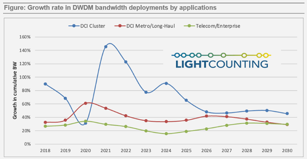 報(bào)告特別預(yù)警DWDM網(wǎng)絡(luò)帶寬壓力:2019-2024年DWDM端口帶寬增長4倍,預(yù)計(jì)2025-2030年將再增6倍。數(shù)據(jù)中心互聯(lián)(Data center interconnect,DCI)和電信企業(yè)網(wǎng)絡(luò)三大應(yīng)用場景的帶寬年增長率將在2030年趨同至30-45%。