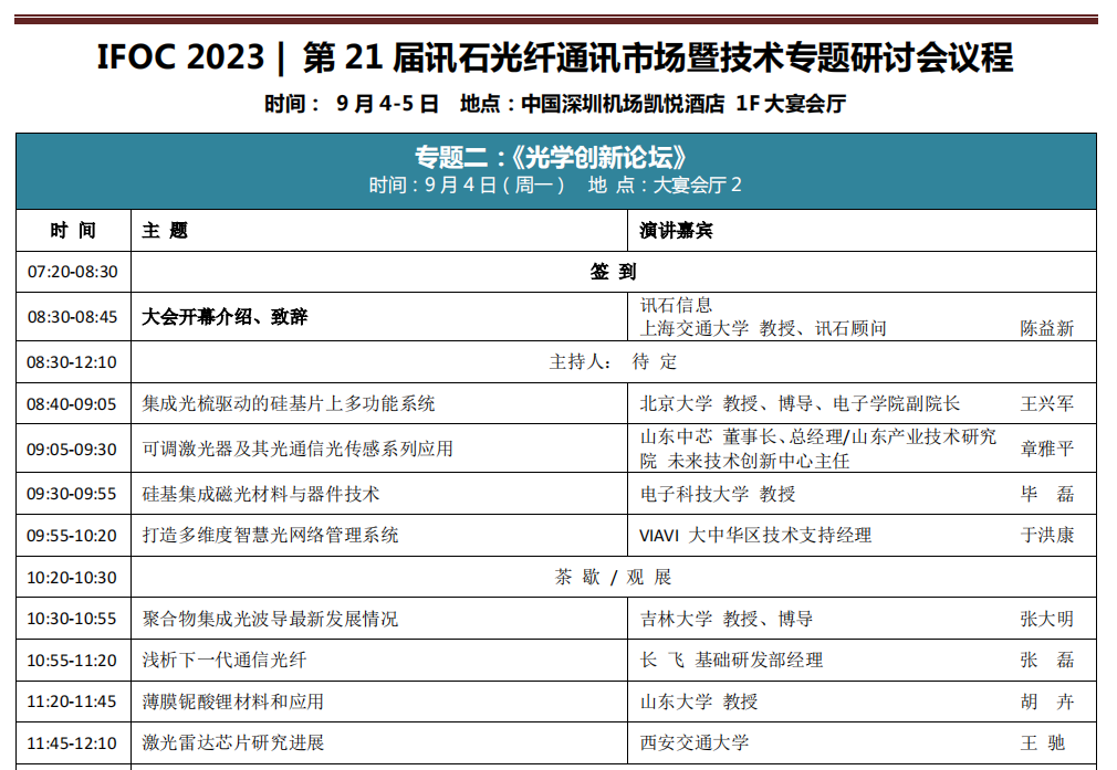 ICC訊 9月4-5日,第21屆訊石光纖通訊市場暨技術專題研討會(iFOC訊石研討會)將在深圳機場凱悅酒店如期舉行,本屆iFOC訊石研討會設立《光學創(chuàng)新論壇》專題會議。2023年市場大環(huán)境充滿挑戰(zhàn),宏觀經(jīng)濟的不確定性,給一些企業(yè)經(jīng)營帶來了挑戰(zhàn)。AI的發(fā)展給光通信帶來了新一輪的增長。下一個光通信發(fā)展趨勢是什么?光學創(chuàng)新論壇將側重邀請大學教授和企業(yè)代表進行探討,圍繞光學創(chuàng)新的技術研究熱點,探尋光通信發(fā)展的新機遇。