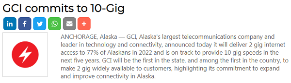 2015年,GCI在安克雷奇(Anchorage)推出了1Gig red服務,將客戶速度提高了四倍,是美國首批向客戶廣泛提供1Gig服務的公司之一。之后,GCI公司迅速擴大了1Gig服務,如今77%的阿拉斯加人居住在GCI的1Gig服務范圍內。