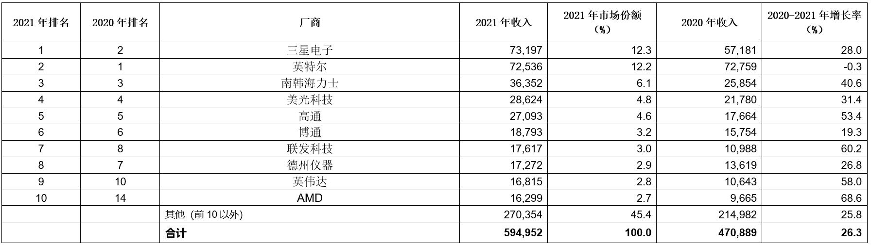 三星電子自2018年以來首次超越英特爾重回第一,盡管領先優(yōu)勢還不到1%,該公司在2021年的收入增長了28%(見表一)。英特爾的收入下降了0.3%,市場份額為12.2%,相較于三星的12.3%。在排名前十的半導體廠商中,2021年內增長最快的是AMD和聯(lián)發(fā)科技,兩家公司在2021年分別增長了68.6%和60.2%。