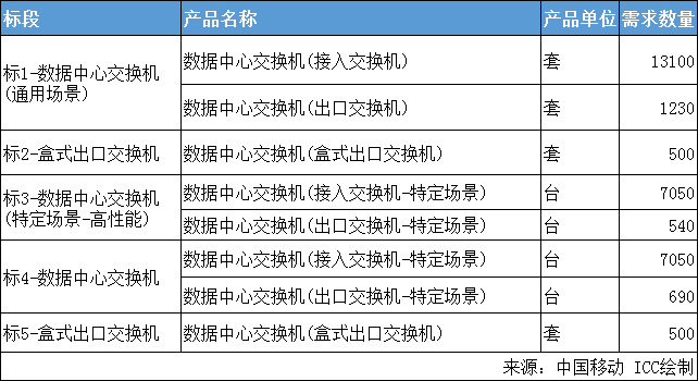ICC訊 中國移動發(fā)布2023年至2024年數(shù)據(jù)中心交換機產(chǎn)品集中采購(新建部分)(招標CMCC20230500065),本次采購滿足期為1年,采購數(shù)據(jù)中心交換機30660臺。