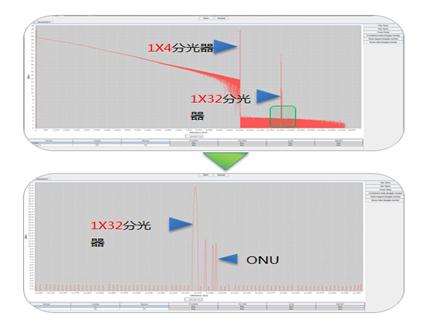 下圖為日海COTDR的樣機(jī)測試波形圖,模擬線路采用了兩級分光,1X4為一級分光,1X32為二級分光。