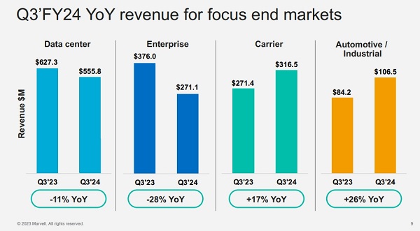 按終端市場劃分,數(shù)據(jù)中心市場營收5.56億美元,同比下滑11.4%,但環(huán)比增長20.88%,其中云業(yè)務(wù)環(huán)比增長超過30%。運(yùn)營商基礎(chǔ)設(shè)施市場營收3.17億美元,同比增長16.62%,環(huán)比增長14.88%,增長主要受到Marvell 5G產(chǎn)品周期驅(qū)動(dòng)。企業(yè)網(wǎng)絡(luò)市場營收2.71億美元,同比下滑27.9%,環(huán)比下滑17.27%,反映了需求疲軟。消費(fèi)者市場營收1.69億美元,同比下滑5.44%,環(huán)比基本持平。汽車/工業(yè)市場營收1.07億美元,同比增長26.48%,環(huán)比下滑3.36%。