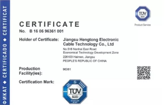 亨通電力產(chǎn)業(yè)集團(tuán)江蘇亨通電子線纜科技有限公司獲得德國(guó)TUV集團(tuán)頒發(fā)的國(guó)內(nèi)首張新能源汽車(chē)車(chē)內(nèi)用電纜產(chǎn)品TUV SUD證書(shū)。